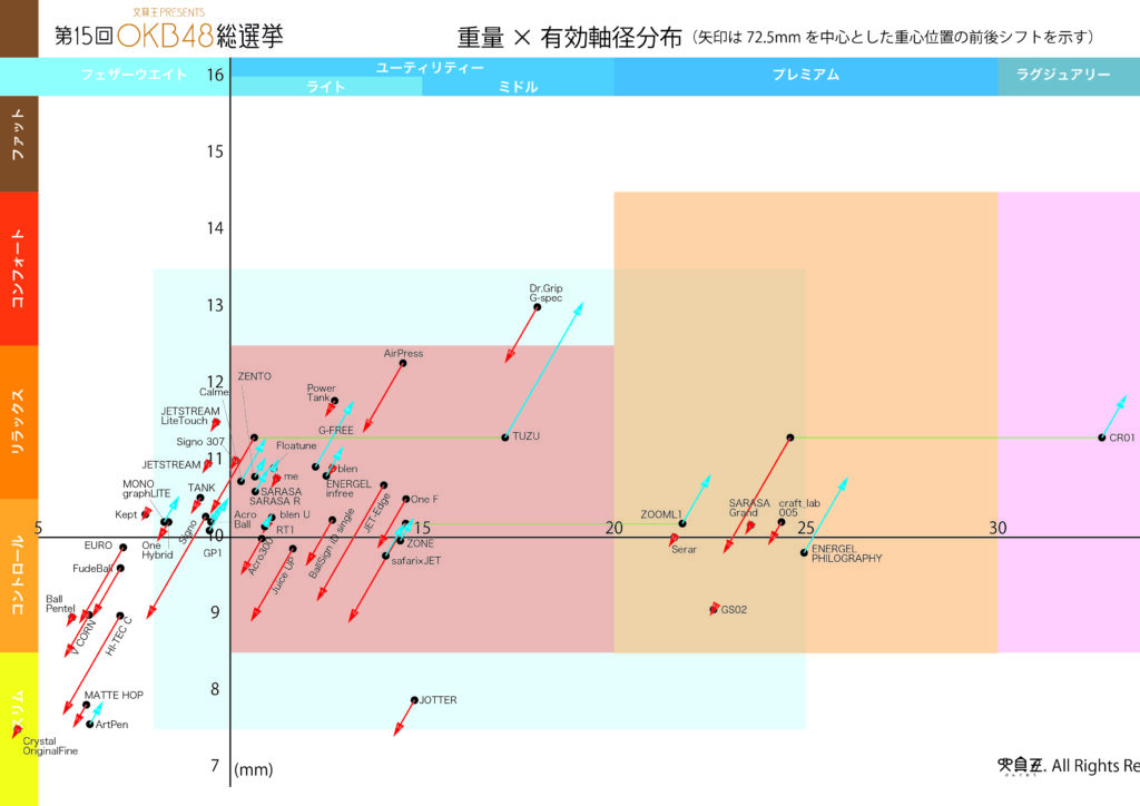 これ、ボールペンの重さ、軸径、重心位置をグラフ化したものです。