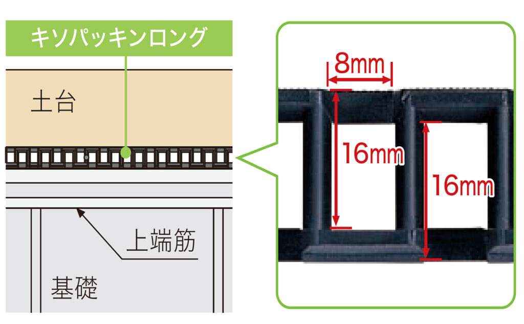 近年は、基礎断熱工法が爆発的に市民権を得たため、この通気を無くし、気密材を加えた「気密パッキン」という部材が使われるように。